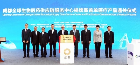 成都全球生物医药供应链服务中心是成都立足全球打造的医药供应链枢纽,也是构建生物产业生态圈的重要组成部分,充分利用成都作为距离欧洲最近国家中心城市的区位优势,以跨国企业需求为导向,依托国际航线、国际班列,搭建高效、柔性、低成本的全球配送网络。跨国医药企业艾尔建价值超过一亿元人民币的首批医疗产品也在本次仪式中现场通关。