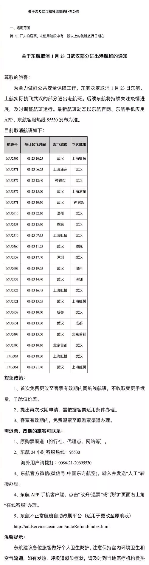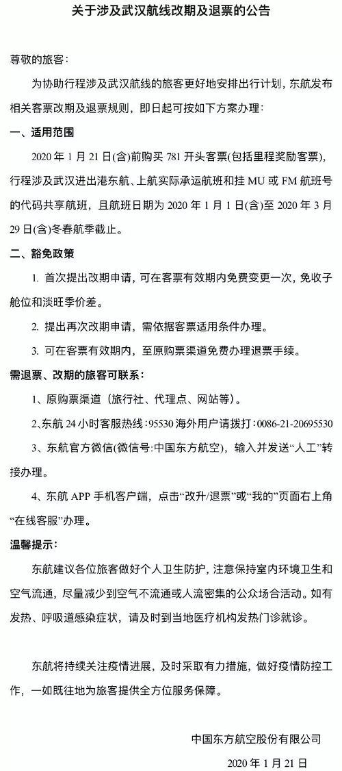 凡在2020年1月31日(含)前购买,旅行日期为2020年1月1日(含)至2020年3月29日(含),涉及武汉的南航实际承运航班(含经停)及挂CZ航班号的代码共享航班的784客票。