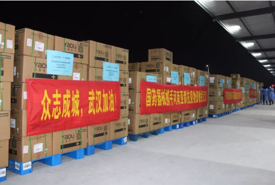 昨日凌晨2时,国药器械、河南亚都捐助的共计290余万件疫区急需医用防护类产品,包括医用外科口罩、一次性使用医用口罩、医用帽、医用手套等,从河南长垣送往武汉,并于当日19时左右顺利交付湖北省新型冠状病毒感染的肺炎防控指挥部,将快速供应相关医疗、疾控机构使用。