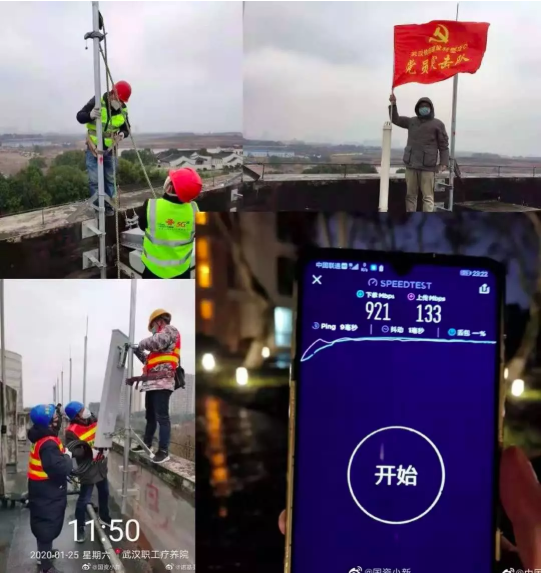 1个小时后,由武汉移动副总经理谢纪鹏带领的突击队完成了基站的调试工作,火神山医院首个5G基站正式开通。