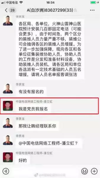 火神山、雷神山医院需要安装几百部电话。中国电信征集志愿者,从各区抽调人员,增强前线保障力量。通知刚刚发出,在工作群里出现了这样一句熟悉的话:我是党员我报名。