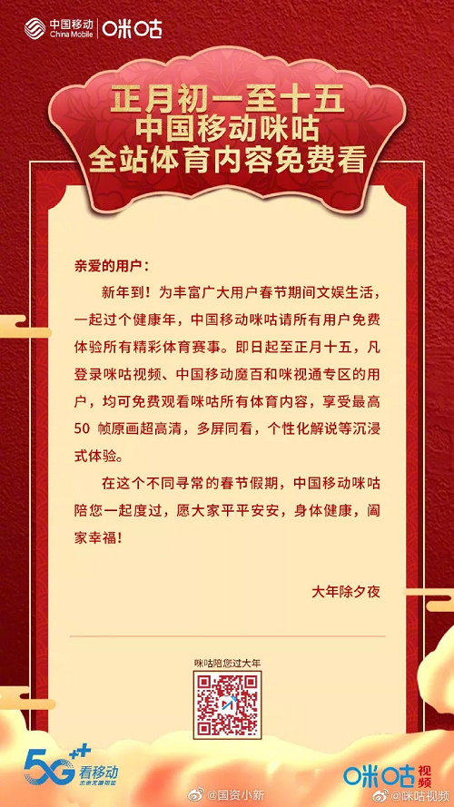 大事需要做,小事也要有人做。对于普通人而言,参与抗击疫情最好的方式,就是不要出门,保护好自己保护好家人,不让自己成为传染源。中国移动咪咕视频开放全站体育内容免费看,为大家提供丰富精彩的精神文化生活。
