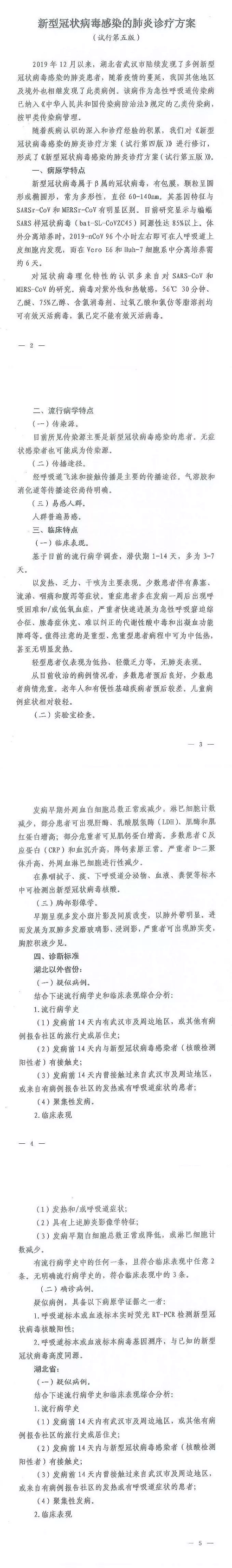 为应对新型冠状病毒感染病患增加,以及危重症患者不断增多的实际情况,2月2日下午相关部门召集权威专家开展联席会议,在《第四版新型冠状病毒感染的肺炎诊疗方案》的基础上修订了第五版试行方案(以下简称“第五版方案”)。
