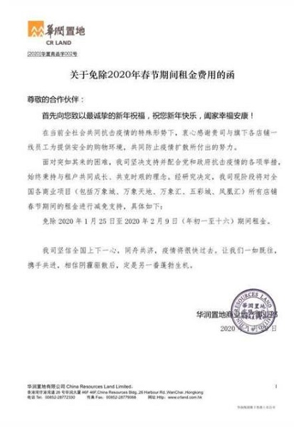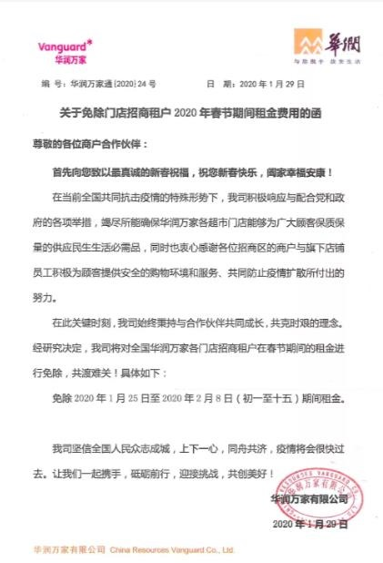 同日,华润万家宣布,免除全国各门店招商租户在春节期间(2020年1月25日至2月8日)租金(含物业管理费),共惠及商户全国约14000家,涵盖经营面积约184万平米,减免金额约1.3亿元。