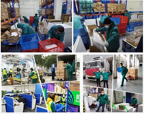 国药物流各地子公司实行24小时接收发货订单,仓库现场24小时值班。接到相关医院的订单后,2小时内即将物资发出。配送员工以车为家,风餐露宿、星夜兼程,克服低温雨雪、高速封路等困难,以“逆行者”的果敢、“神行者”的速度,英勇驰骋于防抗疫情的各个战场之间。