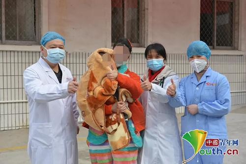 患儿妈妈已于2月8日治愈,为了照顾孩子没有离开隔离病区,今天上午终于盼来宝宝治愈的好消息,母女俩一同出院回家。目前患儿爸爸仍在积极治疗中。
