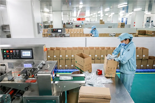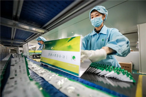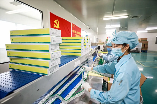 佩戴着口罩、穿着统一制服的工人们在生产线上作业,迅速地将已内包装好的配方颗粒叠好放进外包装盒里,并在包装盒上贴上相应的产品标签。这些产品经过检验后即可供应市场。