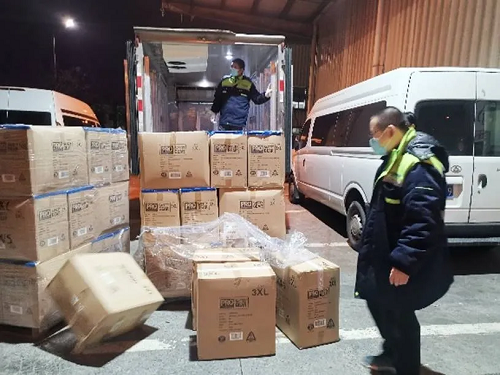 国药控股泰安有限公司连夜装卸央企捐赠的1万余套隔离衣,通过紧急办理相关通行证明、协调济南中铁快运,及时将此批物资发往武汉。