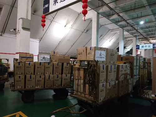 ——中国能建集团捐赠物资,2月15日高效完成了从北京首都机场入境落地、海关清关、机场和东四环两地提货到中铁起运的全部环节,2月16日早上9点武汉签收,全程仅用24小时。