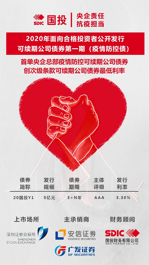 2月18日,国投于深交所成功发行国内资本市场首单央企总部疫情防控可续期公司债券,发行规模5亿元,发行利率3.38%,期限3+N年。债券由安信证券、广发证券承销,财务公司任财务顾问,募集资金将优先用于支持防疫相关成员企业开展防疫物资生产活动。
