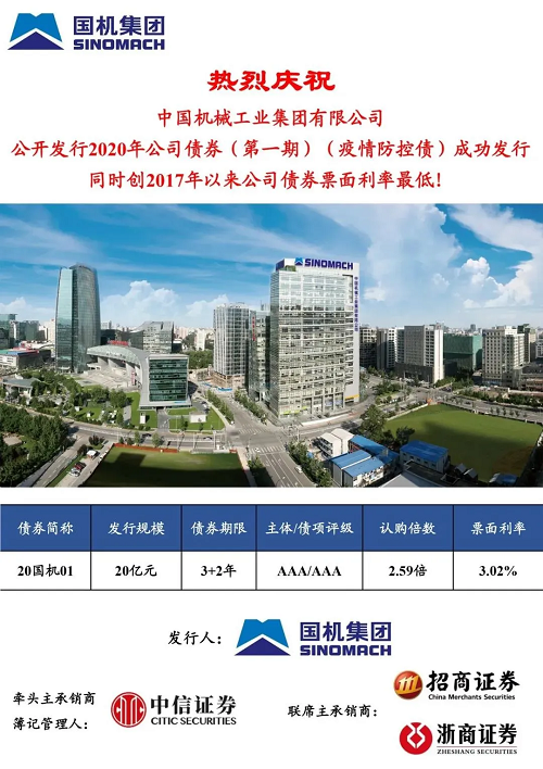 国机集团于2月28日在上海证券交易所市场成功簿记发行中国机械工业集团有限公司公开发行2020年公司债券(第一期)(疫情防控债),发行规模20亿元,部分募集资金将用于各类防疫生产投入,保障企业积极响应疫情防控工作。
