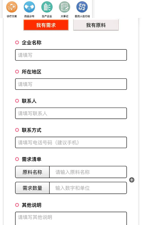 在「原料供需在线填报」页面,您可以发布供应和需求信息,平台将完成审核工作并协助对接。