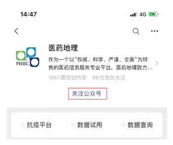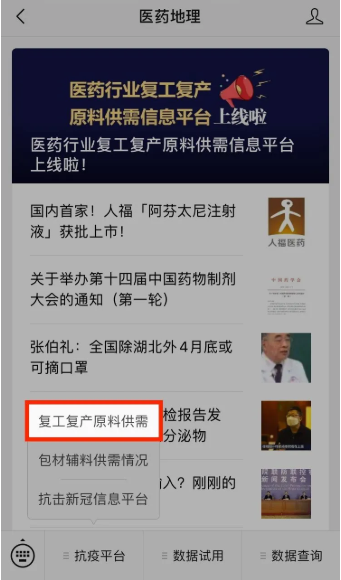 2)扫码或搜索关注“医药地理”公众号,点击公众号下方菜单栏「抗疫平台」中的「复工复产原料供需」进入。