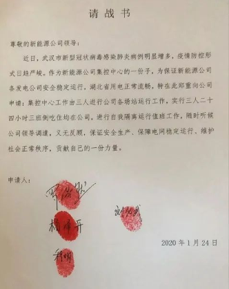 在这次“抗疫保电”的工作中,面对复杂严峻的疫情,罗浩然毫不犹豫放弃了春节假期,主动请缨,带领集控中心其他3名值班员,写下请战书,要求坚守在“抗疫保电”第一线。1月23日,武汉“封城”。1月24日,湖北省启动重大突发公共卫生事件一级应急响应。面对不断蔓延的疫情,公司面临着防疫和保电的双重压力,罗浩然所在的集控中心承担着公司19个投运风电场及光伏电站生产管理的中枢功能。“疫情就是命令,防控就是责任。”由于集控中心位于武汉徐东大街的湖北能源(3.530, 0.00, 0.00%)大厦,为避免换班及路途往返造成的感染风险,经公司同意,罗浩然调整值班安排,带领两名值班员24小时在集控中心值班。
