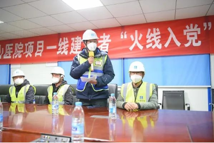 2月2日,中建三局火神山医院项目现场指挥部临时党委研究并报中建三局党委,同意金晖、潘吉建、张克强等8名同志“火线入党”。现场,金晖作为预备党员代表表态:“加入中国共产党是一份光荣,更是一份责任,我们愿同大家一道,不忘初心,不计回报,逆风而行。”工程建设争分夺秒,全员都投入在施工一线,入党仪式后,预备党员立刻回到各自岗位,为冲刺项目交付节点全力拼搏,终于保证医院如期交付投用。