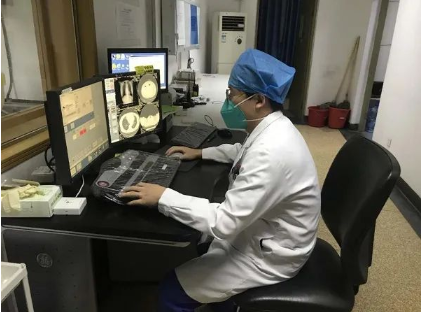 王坤在CT室给患者做肺CT检查