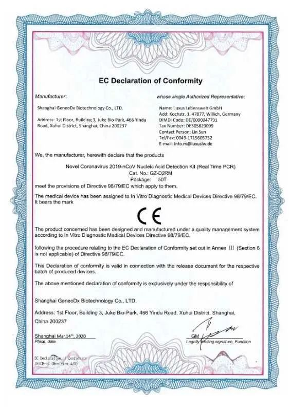 3月14日,国药中国生物上海捷诺完成了自主研发的新型冠状病毒2019-nCoV核酸检测试剂盒(荧光PCR法)的欧盟CE认证。欧盟CE认证表明该产品符合欧盟医疗器械相关指令的符合性要求,具备欧盟市场的准入条件。