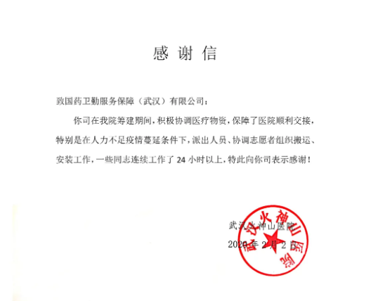 1月26日凌晨(大年初二),公司的首批医疗设备运送到了在建中的火神山医院。国药卫勤不仅成为第一个向火神山医院紧急供应医疗物资的团队,还义务协助完成了物资搬运工作,收到了院方发来的感谢信。