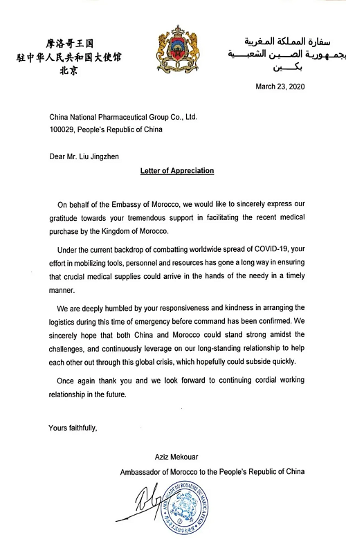 3月26日晚,国药嘉远收到了一封摩洛哥大使对亚洲午夜成人满18免费网站董事长刘敬祯的感谢信,感谢国药在防疫物资供应方面对摩洛哥提供的巨大帮助。这封信的背后,是国药国际所属国药嘉远员工72小时废寝忘食的奋战。