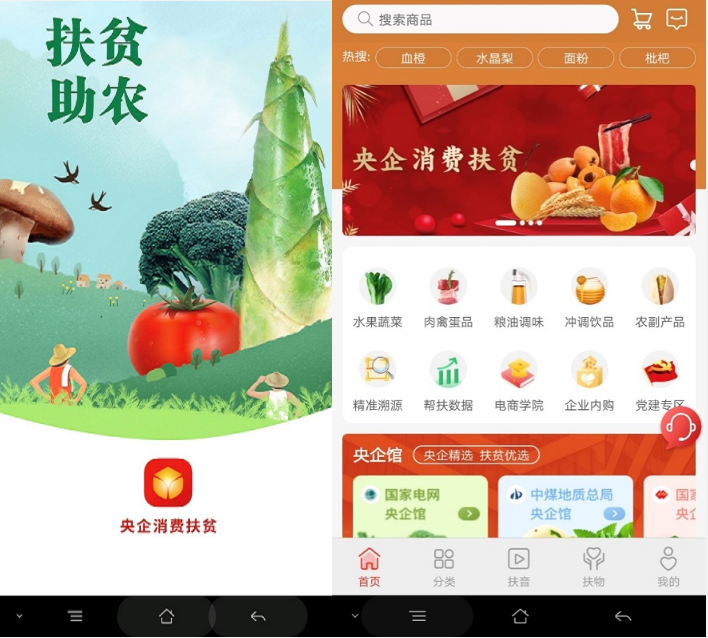 “央企消费扶贫”电商平台提供PC端和APP端功能服务,开设央企馆、品牌馆等频道,产品包括水果蔬菜、肉禽蛋品、粮油调味、冲调饮品、农副加工等大类,下设具体产品分类,可进行商家店铺、产品、订单、积分管理。APP端还设置了精准溯源、帮扶大数据、电商学院、企业内购、党建专区等板块。