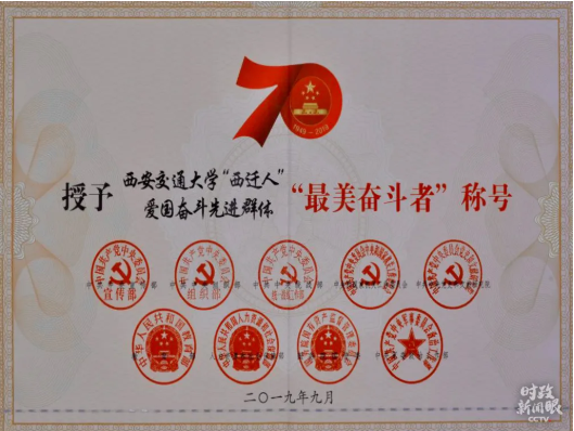 △去年,西安交通大学“西迁人”爱国奋斗先进群体被授予“最美奋斗者”称号。致敬词这样写道:“你们是铺路石,金子般闪耀在岁月的最深处;你们是螺丝钉,钻石般旋转在共和国的年轮里。”