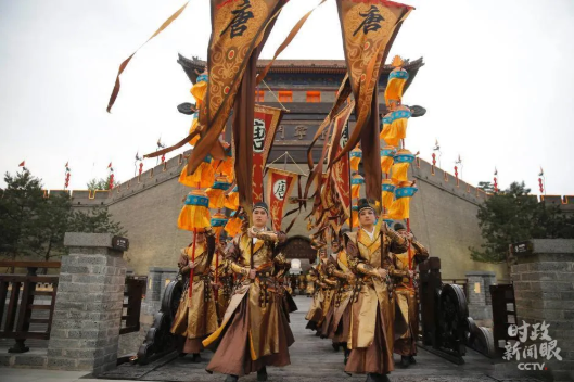 △2015年5月14日,古城楼永宁门外,盛唐武士和宫女正在列队迎宾。