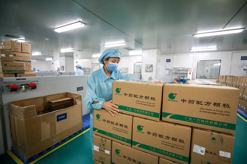 图为中国中药旗下广东一方制药有限公司制剂车间外包环节。疫情期间,中国中药生产线上仍持续不断生产重点防疫产品。中国中药供图