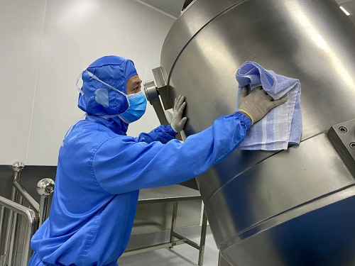 国药现代上海事业部总混岗位车间员工爱惜地擦拭着生产设备。