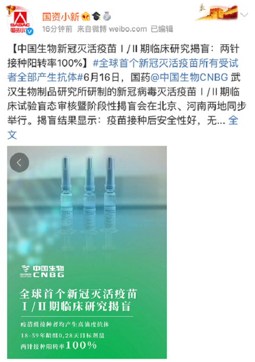 6月16日,国药中国生物武汉生物制品研究所研制的新冠病毒灭活疫苗Ⅰ/Ⅱ期临床试验盲态审核暨阶段性揭盲会在北京、河南两地同步举行。国务院联防联控机制疫苗专班、国家科技部生物技术发展中心有关专家出席。
