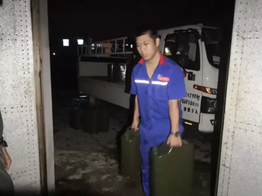 九江庐山石油隘口加油站工作人员桂骏为庐山市沙湖山防汛指挥紧急灌桶1140升。