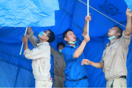 下午5点至凌晨1点,8个小时,近400顶帐篷,2500米建设线已在消泗乡铺设完毕。