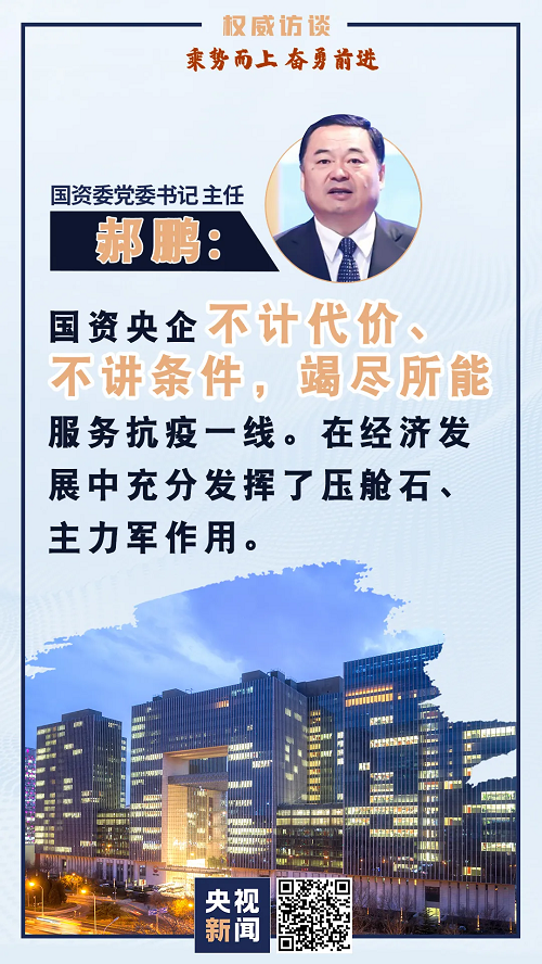 国资委党委书记 主任 郝鹏:今年上半年在以习近平同志为核心的党中央坚强领导下,国资委和中央企业勇于担当、奋力拼搏,在疫情防控中充分发挥了顶梁柱、国家队作用。国资央企不计代价、不讲条件,竭尽所能服务抗疫一线。在经济发展中充分发挥了压舱石、主力军作用。中央企业迎难而上、顶压前行,带头推进复工复产,积极促进经济社会秩序恢复正常。