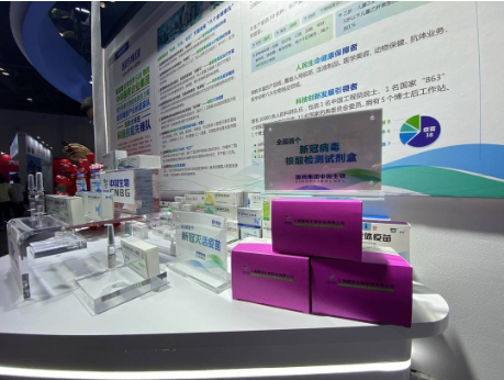展台上摆放着中国生物生产的新冠灭活疫苗、核酸检测试剂盒等产品。记者注意到,这款新冠灭活疫苗包装盒上标示着:仅用于临床研究,每支疫苗含量0.5ml。