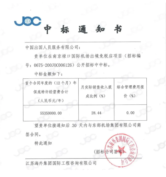 11月20日,南京禄口国际机场免税业务招标项目招标代理公司正式向中国出国人员服务有限公司(以下简称“中服免税”)发出中标通知书,中服免税成功中标南京禄口国际机场2号航站楼出境免税店8年经营权。