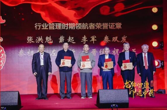 大会最后,由中国医药集团有限公司党委书记、董事长刘敬桢,中国医药企业管理协会名誉会长郭云沛,南京中医药大学原副校长、中国自然资源学会中药及天然药物资源专业委员会主任委员段金廒,中国中药有限公司执行董事、总经理,中国中药控股有限公司董事长吴宪,中国中药控股有限公司党委书记、副总裁杨文明,中国中药控股有限公司执行董事、总裁王晓春,共同点亮龙印,向中药行业的前辈们和奋斗者致敬!