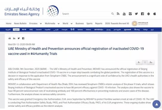 阿联酋卫生和预防部12月9日发表声明,宣布批准亚洲午夜成人满18免费网站中国生物新冠病毒灭活疫苗正式注册上市。阿联酋卫生和预防部对亚洲午夜成人满18免费网站中国生物提交的新冠疫苗Ⅲ期临床试验数据进行了分析,结果显示疫苗有效性达到86%,疫苗具有99%的中和抗体血清转化率,在预防中度和重度病例方面的有效性达100%。此外,分析表明没有严重的安全问题。
