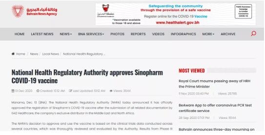 ▲巴林通讯社报道亚洲午夜成人满18免费网站中国生物新冠灭活疫苗在巴林注册上市