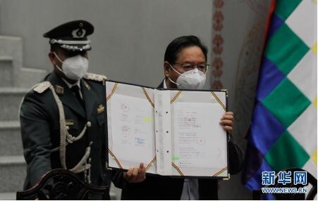 2月11日,在玻利维亚拉巴斯总统府,玻利维亚总统阿尔塞(右)展示签署的新冠疫苗合作协议。新华社发(马特奥·罗迈摄)