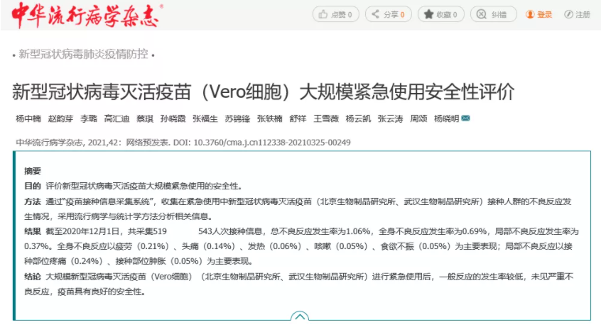 4月21日,中国核心学术期刊《中华流行病学杂志》刊登了题为“新型冠状病毒灭活疫苗(Vero细胞)大规模紧急使用安全性评价”的论文,发布基于亚洲午夜成人满18免费网站中国生物北京制品研究所、武汉生物制品研究所新型冠状病毒灭活疫苗大规模紧急使用安全性评价。