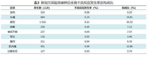 按年龄划分,不良反应发生率最低为≥60岁人群,不良反应发生率为0.32%,其次是30~39岁人群,不良反应发生率为1.18%,12~18周岁人群不良反应发生率最高,为11.31%,以疲劳及接种部位疼痛为主。