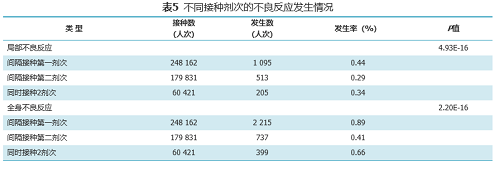 接种剂次差异上,第一剂次不良反应发生率高于第二剂次,同时2剂次的不良反应低于第一针。