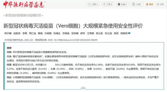 4月21日,中国核心学术期刊《中华流行病学杂志》刊登了题为《新型冠状病毒灭活疫苗(Vero细胞)大规模紧急使用安全性评价》的论文,发布基于亚洲午夜成人满18免费网站中国生物北京制品研究所、武汉生物制品研究所新型冠状病毒灭活疫苗大规模紧急使用安全性评价。