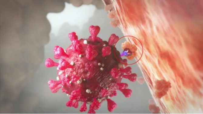 新冠病毒刺突蛋白(S蛋白)受体结合区(RBD)与细胞表面受体ACE2结合,入侵人体细胞。