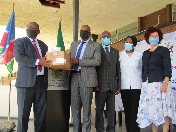 4月16日,纳米比亚卫生部长尚古拉(左一)在温得和克出席仪式接收首批“新冠肺炎疫苗实施计划”疫苗。新华社发(卡萨克摄)