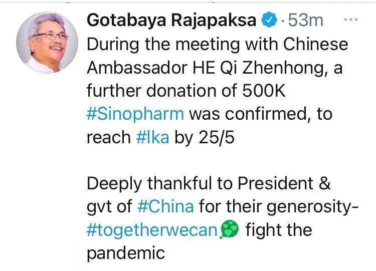 【环球网报道】刚刚,斯里兰卡总统戈塔巴雅·拉贾帕克萨在推特上发文,感谢中国对斯里兰卡的疫苗援助。