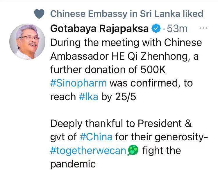此外,中国驻斯里兰卡大使馆的推特账号很快也点赞了拉贾帕克萨的这条推特。