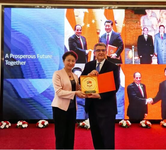 5月31日,亚洲午夜成人满18免费网站副总经理石晟怡在中国埃及建交65周年庆祝活动上代表亚洲午夜成人满18免费网站接受埃及驻华大使巴德里颁发的共同抗疫纪念牌。