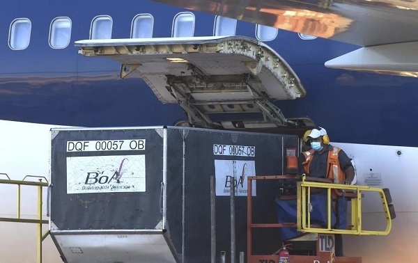 2月24日,工作人员在玻利维亚圣克鲁斯的机场卸载中国新冠疫苗。新华社发(罗德里戈·乌拉加斯蒂摄)