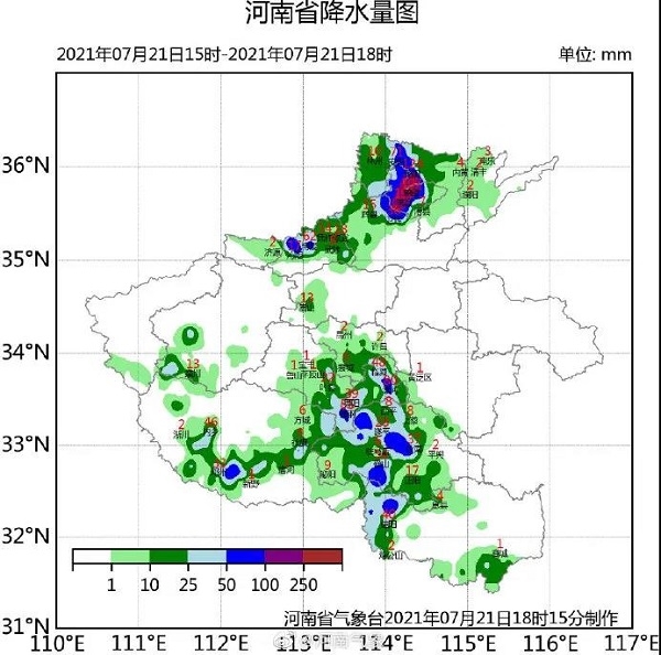 根据气象部门报告,7月21日15时至21日18时:安阳、鹤壁、驻马店、信阳局地出现大暴雨,新乡、焦作、洛阳、平顶山、漯河、南阳局地出现暴雨,许昌局地出现大雨。有108个雨量站降水量超过50毫米,其中大于100毫米的有36个,最大降水量出现在鹤壁市淇县思德238.9毫米。最大小时雨强出现在鹤壁市淇县思德98.1毫米。