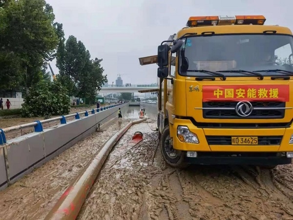 ▲ 中国安能唐山救援基地1台龙吸水、35名救援人员,7月21日1时40分开始在京广北路隧道由南往北闸道口东侧,以每小时约3000方的排量,展开抽排水救援。截至7月21日下午5时40分,已完成抽排水1.2万方,该闸道口路面已露出8米,水位下降1米。